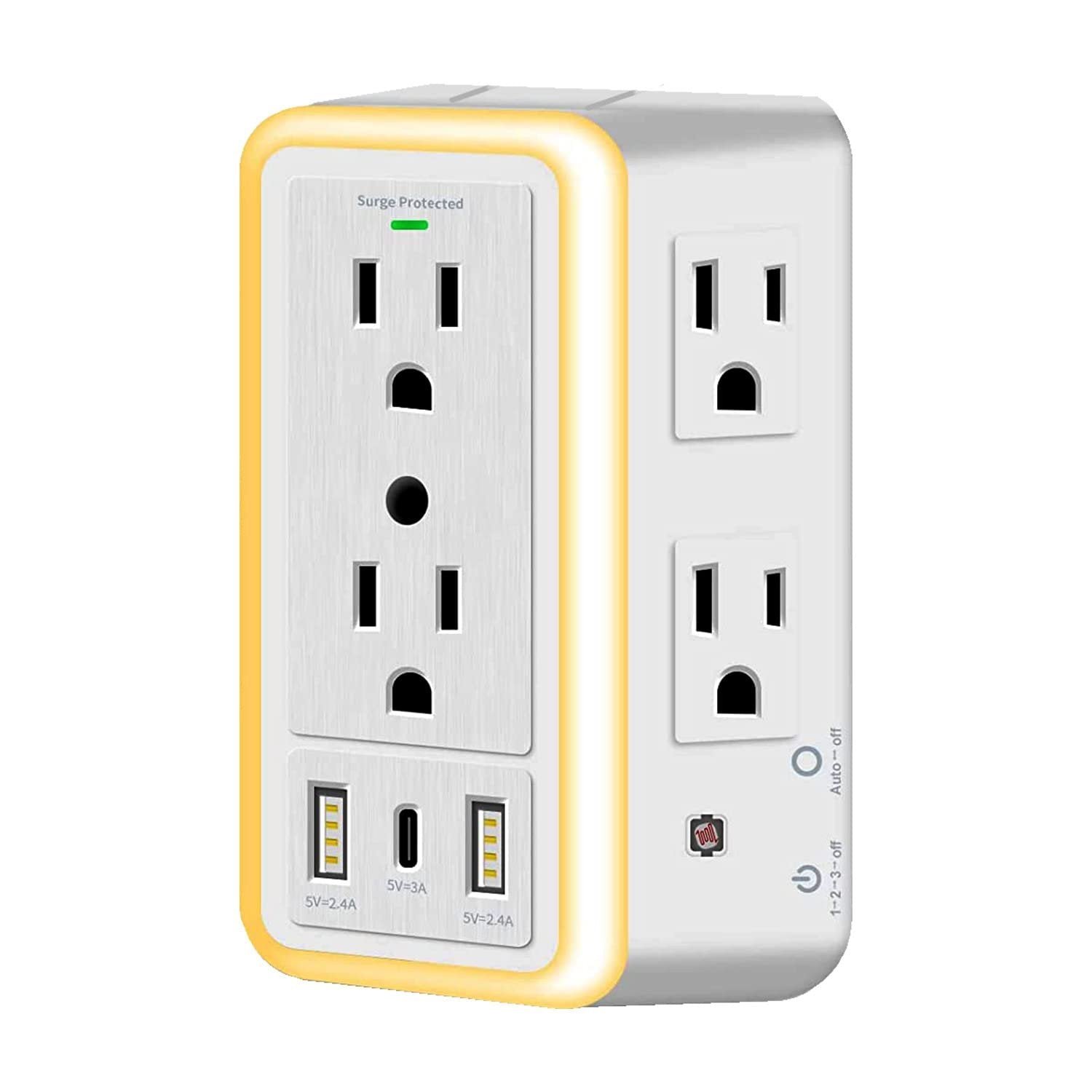 6 AC outlets with 2.1 inches long space in between,2USB A & 1USB C Smart Charging Ports(Total 2.4A)Smart night light with touch sensor, three levels ofadjustable brightness let you choose the right amount oflight for your own needs.